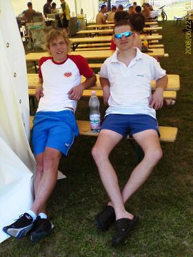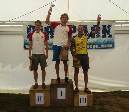 Másnap reggel időben kivonultunk a helyszínre, ahol csodálkozva vettük tudomásul, hogy a környék eléggé kihalt, igencsak kevés autót és bicajt látni. A szokásos előkészületek, bemelegítés után felálltunk a rajthoz, ahol a rövidtávon mindössze 20-an indultunk. A első 1 km-es aszfaltos fölfelén együtt haladt a boly, majd szép fokozatosan igyekeztünk előbbrehelyezkedni. Terepre kiérve Stipi bekezdett, én meg igyekeztem követni, aminek a következménye az lett, hogy 5 perc múlva, néhány mászás után már senki nem volt látótávolságban mögöttünk. Az emelkedőkön meg-megközelítve, a lefeléken el-elmaradva követtem Stipit, míg a 8-10. km-nél be nem várt. Innen együtt mentünk tovább, váltogatva egymást, előzgetve a középtáv lassabb versenyzőit. A pályára nem volt panasz, hol murvás, hol erdei talajú, rendesen hullámvasutazós, néhány sárfolttal tarkítva az erdős részeken. Több helyen a kaszáló oldalában tekertünk, ami tekintettel a Nap állására 35-39 °C-os hőmérsékletet eredményezett. A vége előtt 10 km-el Stipi ellépett, néha-néha láttam csak felbukkanni a piros-fehér mezt. Az utolsó kilométereken volt minden, tekertünk kaszált mezőn, erdőkivágáson, keresztül, majd beértünk a Dirtparkba, ahol a domboldalban kb. még 1 km-t cikcakkoztunk, ezután leereszkedtünk és következett a célkapu. Egészen az utolsó kanyarig nem hittem el, hogy senki nem fogott be bennünket, így 1 perccel Stipi után gurultam be a célba. Nem sokkal utánunk Andris a Dirtpark egy másik részén bukkant elő. Valahol elkevert a végén, így nem tudott finishelni, visszamenni pedig már nem volt kedve... |